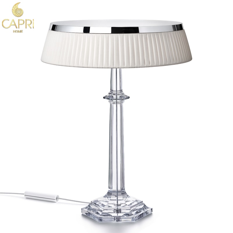Chụp đèn là vải xếp li màu ngà, phía trên đỉnh đèn trang trí phần đĩa mạ Crom tạo sự lộng lẫy cho ánh sáng.nó sử dụng loại đèn leg máng hiện đại,dây cáp điện màu xám nhạt được bện vải nhìn sang trọng,bộ biến áp-phích cắm màu trắng.