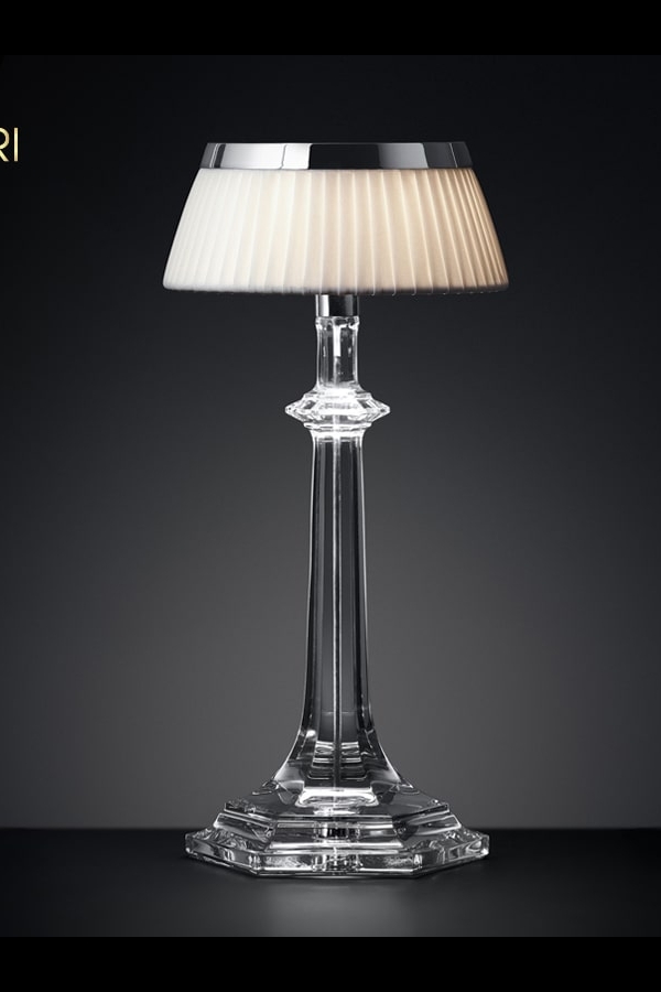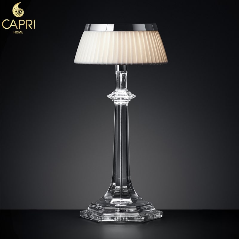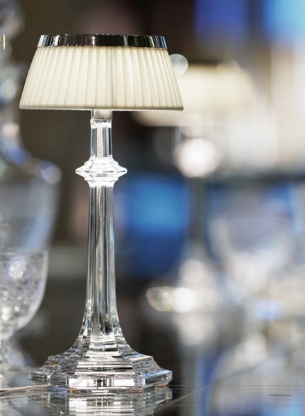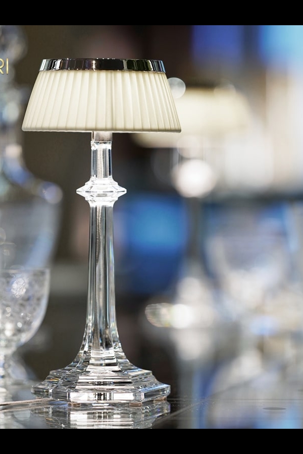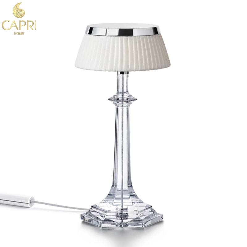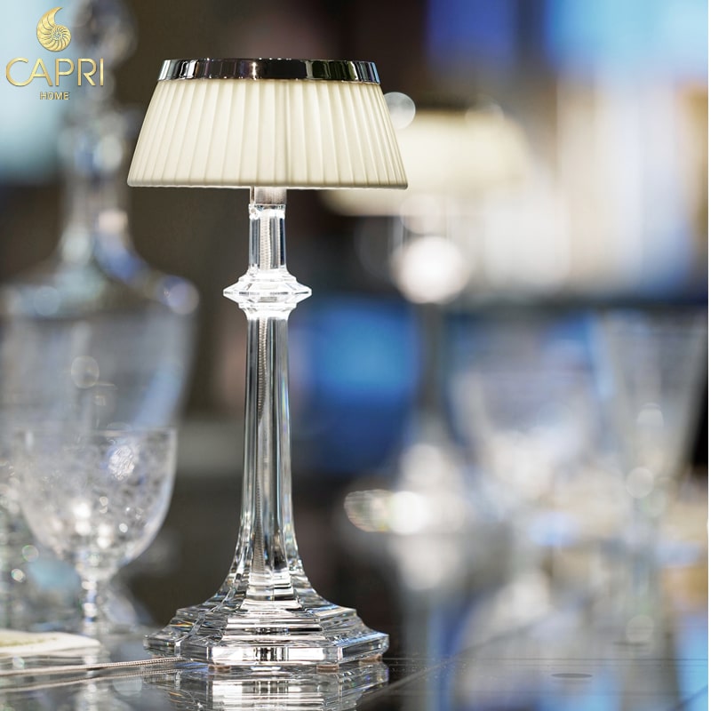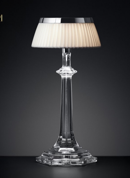 Đèn bàn Bon Jour là một loại đèn với thiết kế mới của Baccarat,nó không hề mang xu hướng cổ điển như những mẫu đèn trước đó mà hoàn toàn là sự hiện diện của phong cách hiện đại.Nó có đế là pha lê cắt “sườn phẳng” và hình bát giác. Chụp đèn là vải xếp li màu ngà, phía trên đỉnh đèn trang trí phần đĩa mạ Crom tạo sự lộng lẫy cho ánh sáng.nó sử dụng loại đèn leg máng hiện đại,dây cáp điện màu xám nhạt được bện vải nhìn sang trọng,bộ biến áp-phích cắm màu trắng.