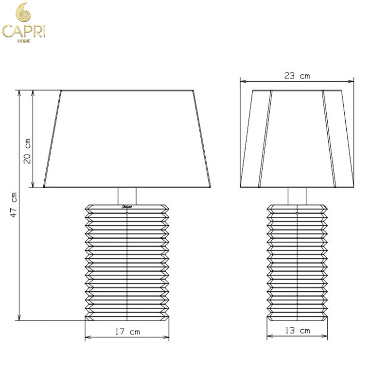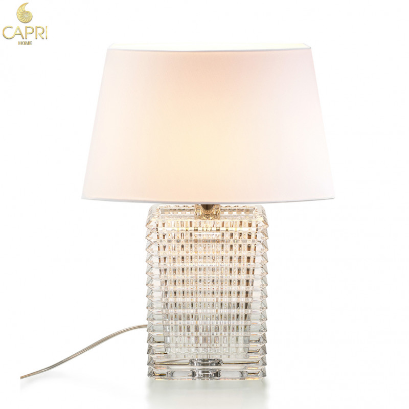Đèn bàn cao cấp thiết kế với các đường cắt vát dọc và ngang tạo ra các vết cắt kiểu kim cương.Phần chụp đèn là vải cao cấp màu trắng,cấu trúc xương chụp đèn và chân gắn bóng là thép không rỉ mạ Crom sáng bóng.
