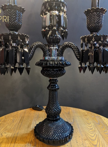 Đèn bàn cao cấp thân là 1 thanh thẳng xoắn được gia công thủ công, phần giá đỡ là thủy tinh cao cấp với các đường gân vằn đan lưới, trang trí bên dưới là các viên pha lê bát giác và một viên pha lê có màu đỏ đây là sự ký hiệu đặc trưng của Baccarat .