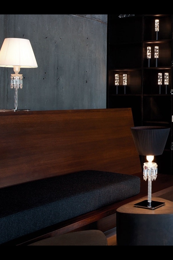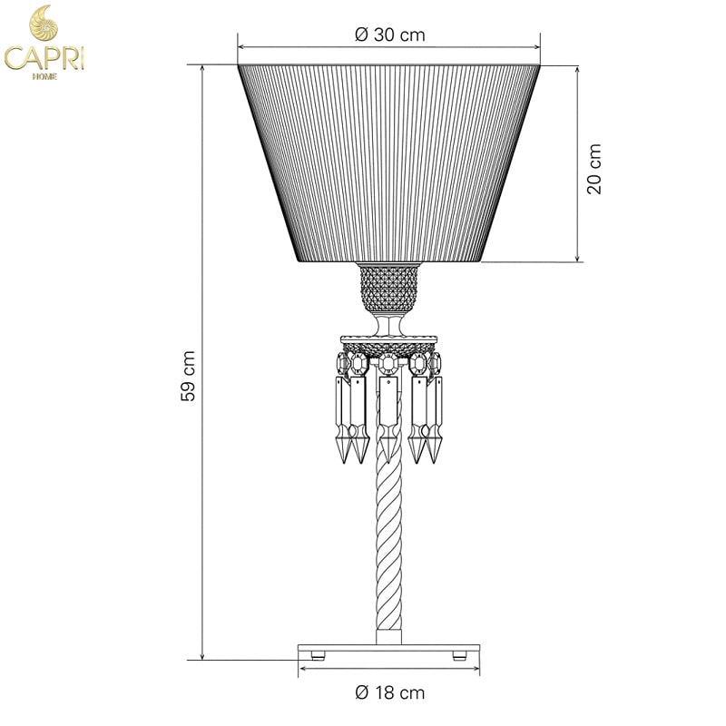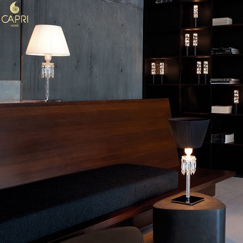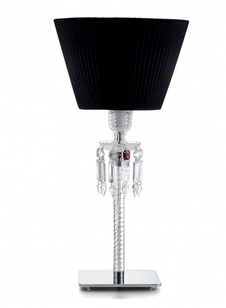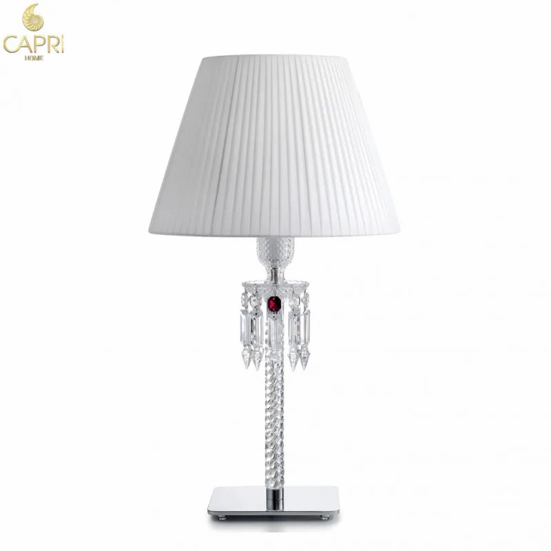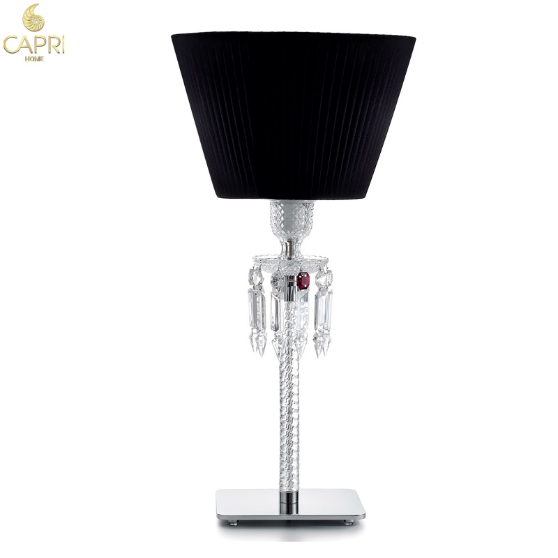 Đèn Bàn Baccarat Torch cao cấp Có thân là 1 thanh thẳng xoắn được gia công thủ công, phần giá đỡ là thủy tinh cao cấp với các đường gân vằn đan lưới,trang trí bên dưới là các viên pha lê bát giác và lăng kính ,nổi bật là một viên pha lê bát giác màu đỏ đây là ký hiệu đặc trưng của Baccarat . Chân đèn làm bằng đồng thau mạ niken bóng gương, chụp đèn là vải lụa xếp li cao cấp, dây nguồn trong suốt .