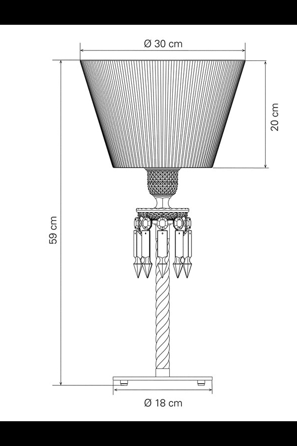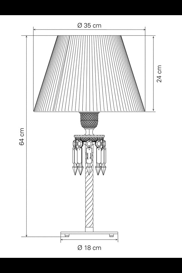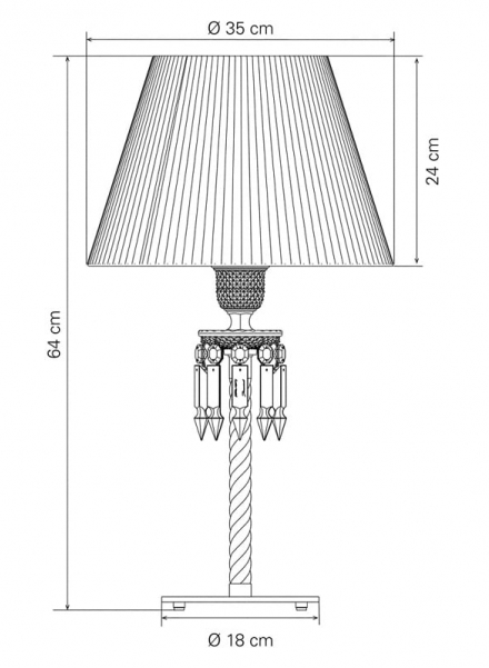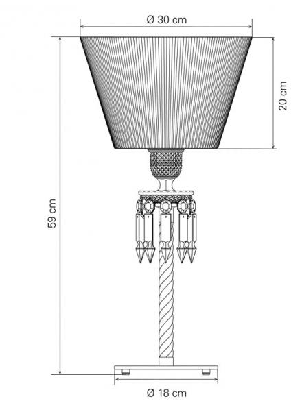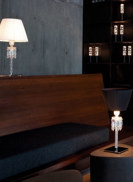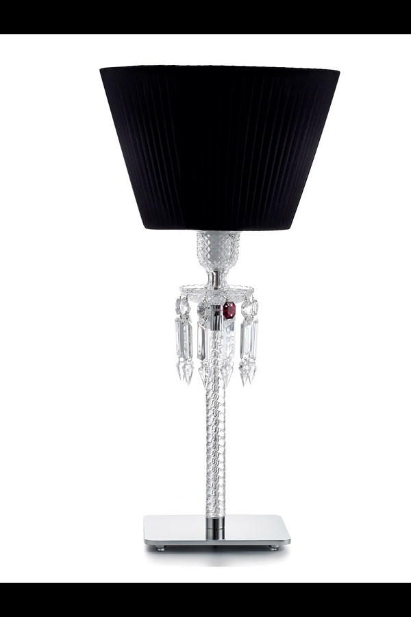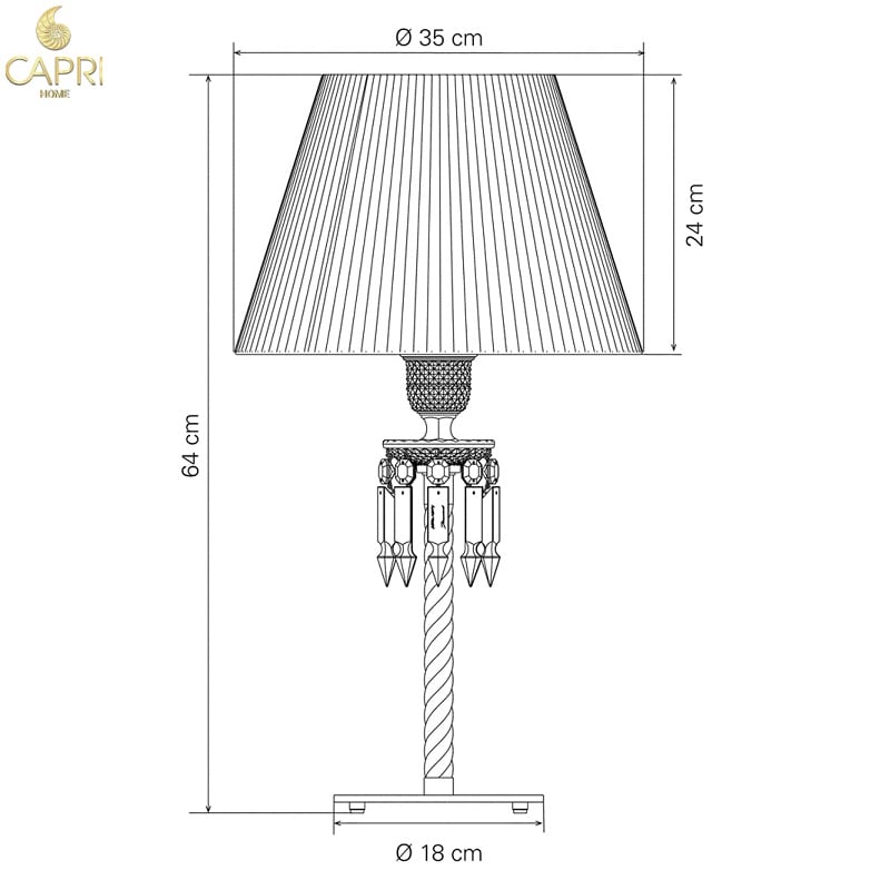 Đèn Bàn Baccarat Torch cao cấp Có thân là 1 thanh thẳng xoắn được gia công thủ công, phần giá đỡ là thủy tinh cao cấp với các đường gân vằn đan lưới,trang trí bên dưới là các viên pha lê bát giác và lăng kính ,nổi bật là một viên pha lê bát giác màu đỏ đây là ký hiệu đặc trưng của Baccarat . Chân đèn làm bằng đồng thau mạ niken bóng gương, chụp đèn là vải lụa xếp li cao cấp, dây nguồn trong suốt .