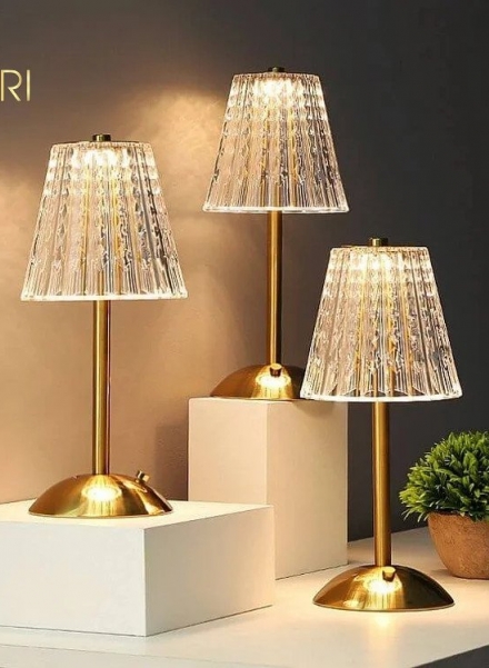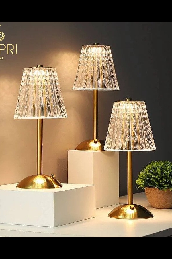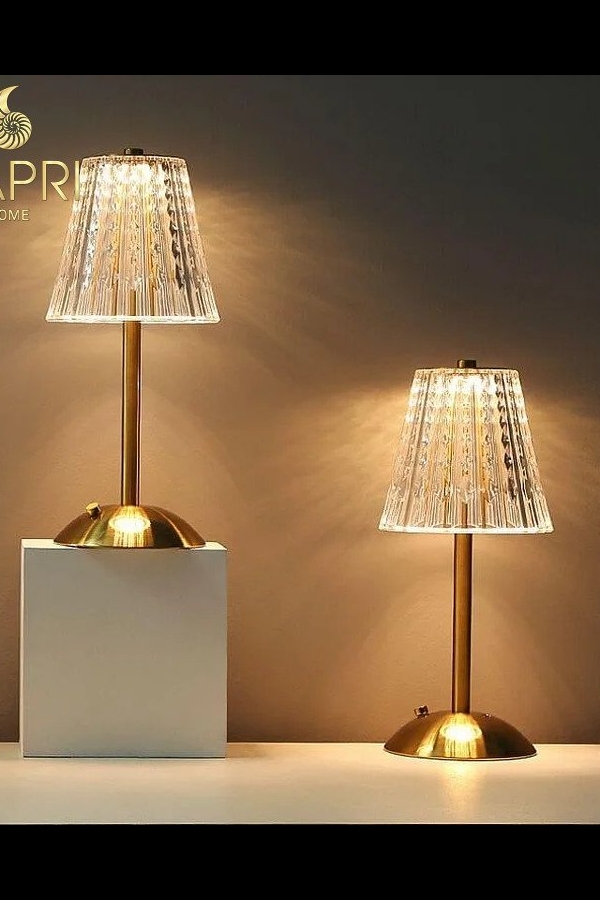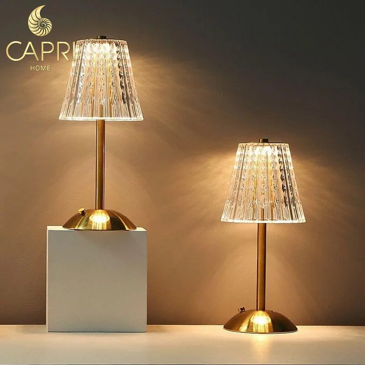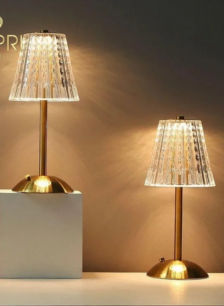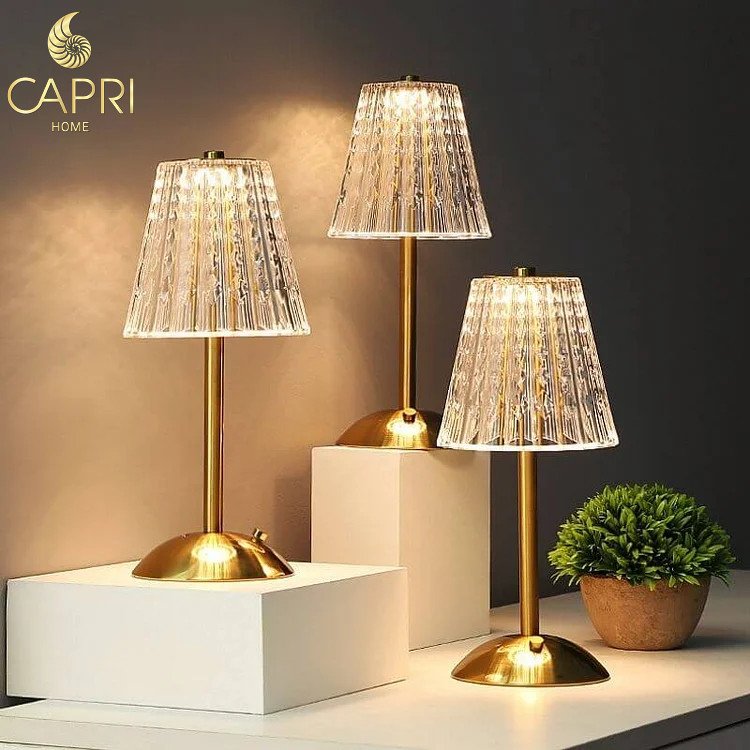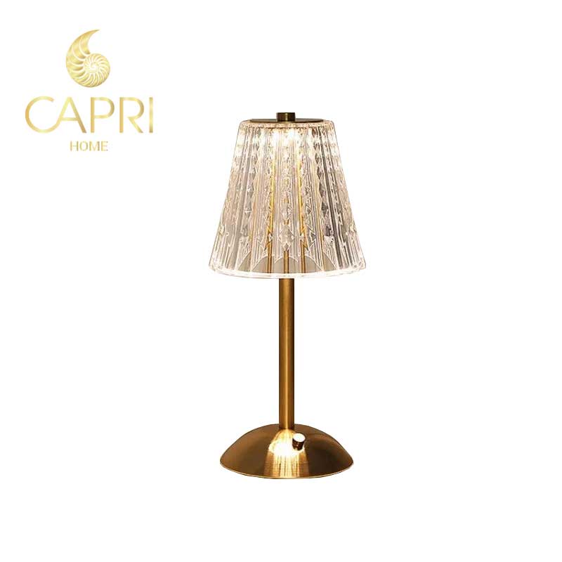 Đèn bàn Pha Lê không dây – thân thép không gỉ kéo sợi màu vàng đồng bóng.