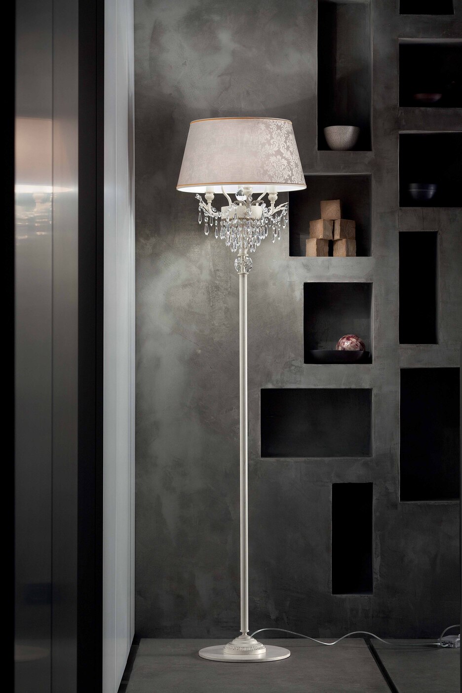 Metal frame. Crystal pendants and Damask fabric lampshades